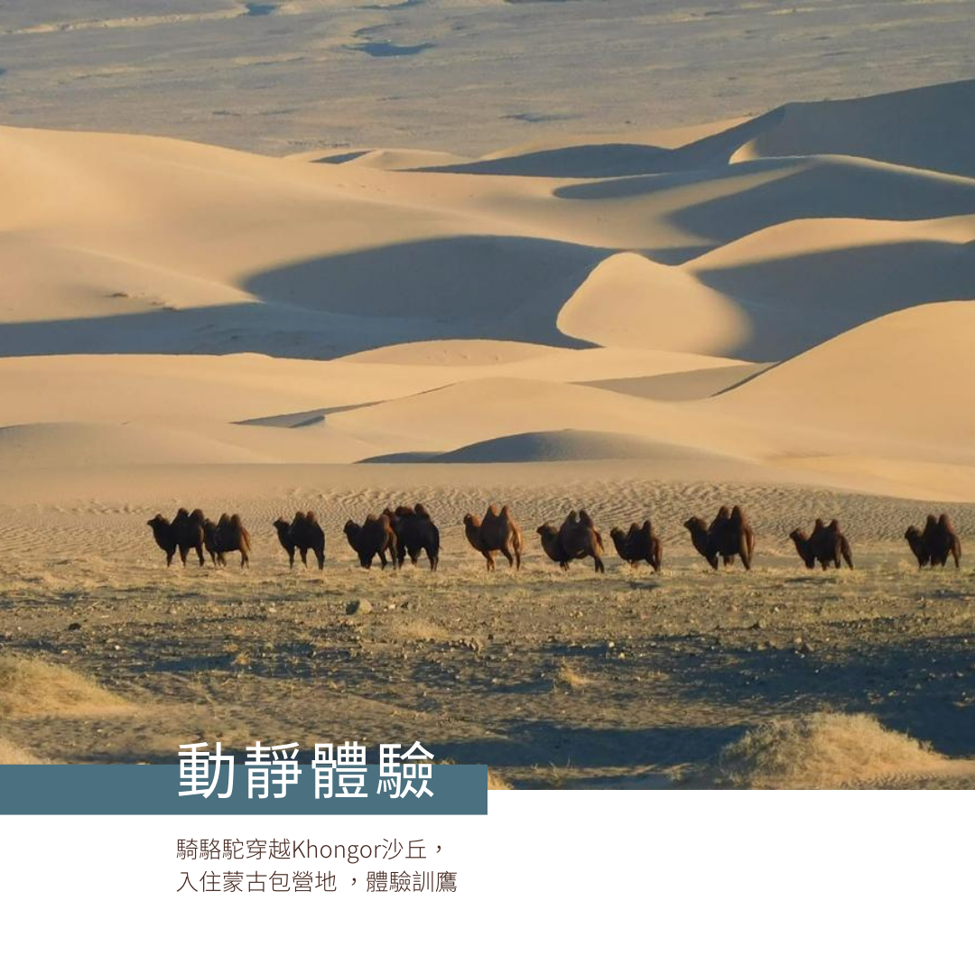 騎駱駝穿越Khongor沙丘,入住蒙古包營地 ,體驗訓鷹。