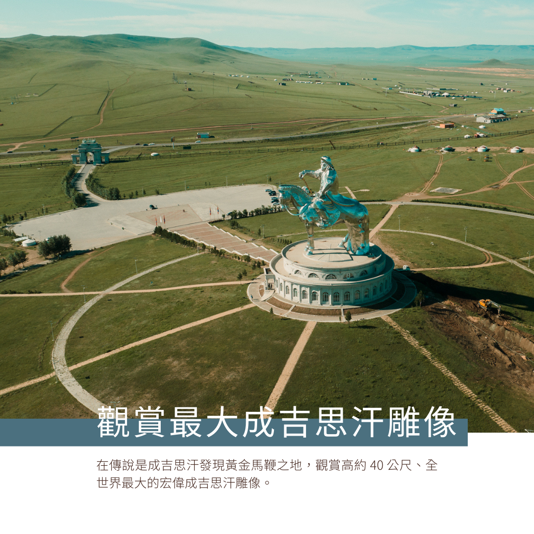 在傳說是成吉思汗發現黃金馬鞭之地,觀賞高約 40 公尺、全世界最大的宏偉成吉思汗雕像。