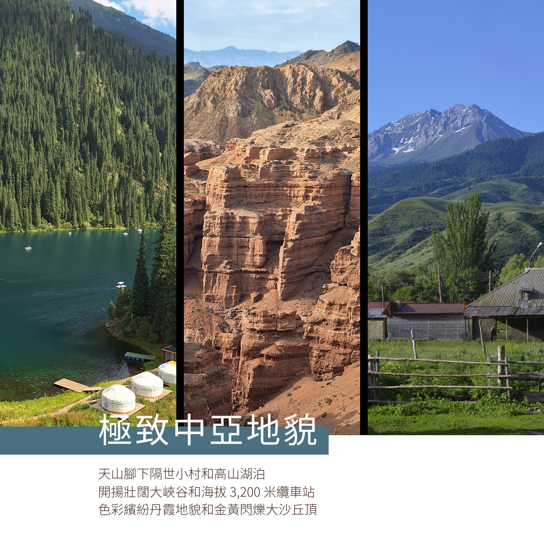乘坐纜車直達海拔三千米高山,登上巨型沙丘和遠眺七色彩山,徒步欣賞中亞最大峽谷,體驗中亞版原始 sauna,馬背上感受湖泊森林。