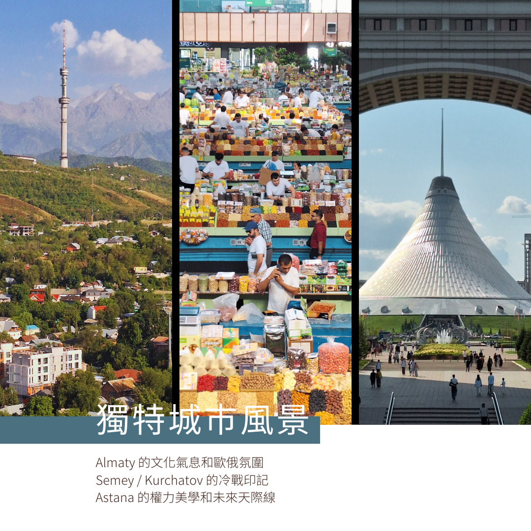Almaty 的文化氣息和歐俄氛圍,Semey / Kurchatov 的冷戰印記,Astana 的權力美學和未來天際線。
