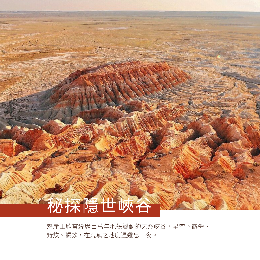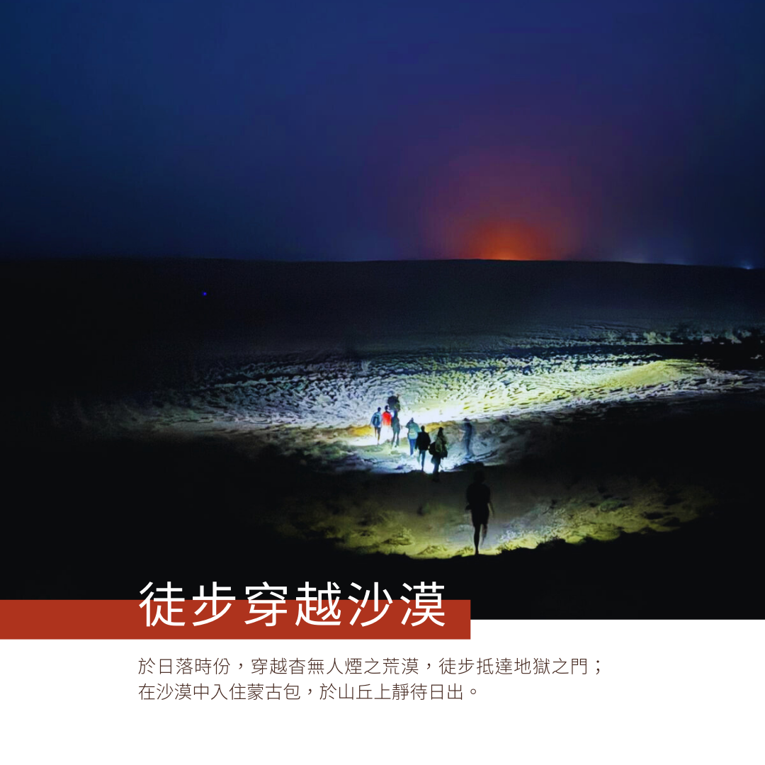穿越杳無人煙之荒漠,徒步抵達地獄之門;在沙漠中入住蒙古包,於山丘上靜待日出。