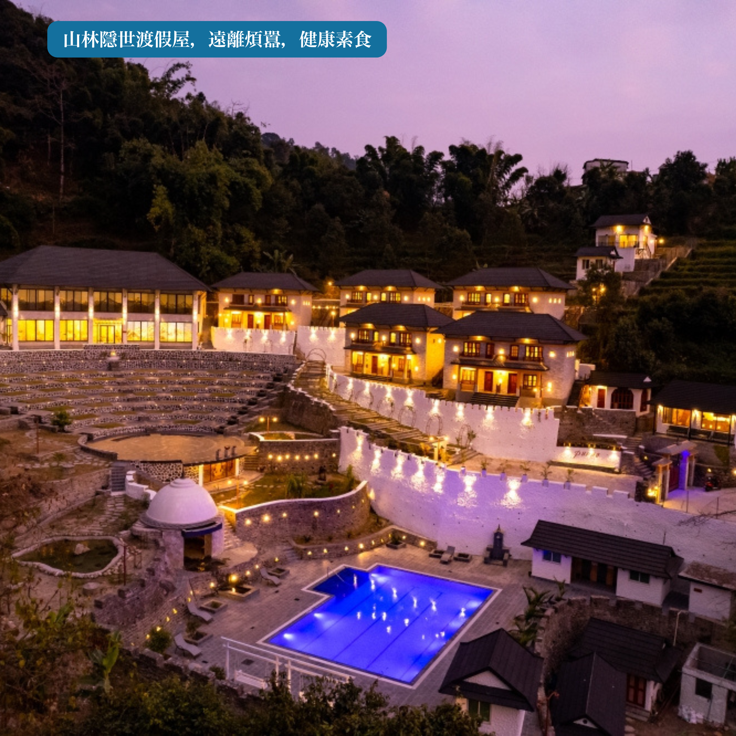 優美山林渡假村寧靜隱秘,一應俱全,讓大家遠離煩囂,好好聆聽自己。除了大自然中漫步冥想,也在精緻的養生會館內享用自然餐點、蒸氣浴、美容按摩,好好睡覺好好吃飯,照顧身體。瑜伽由經驗導師帶領,無論你是新手還是有經驗的修行者,都能在這裡找到內心的平靜與力量。
